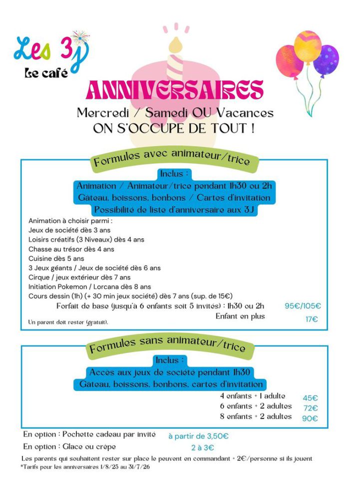 Un parent de l'enfant fêtant son anniversaire au minimum doit rester avec l'animatrice ou l'animateur. Le parent n'a pas à payer l'accès jeux.